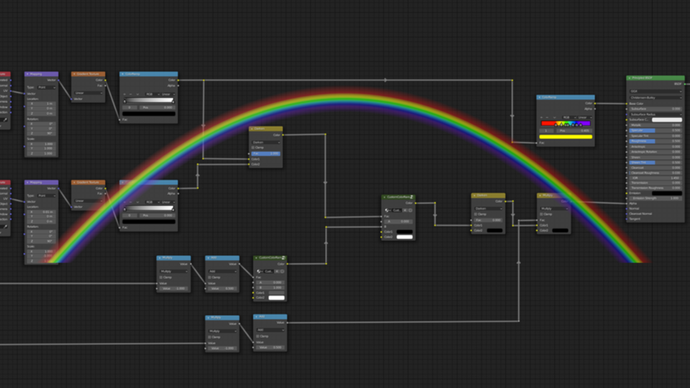 A Blender material node group allowing for the creation of easy, stylized procedural rainbows in the node editor.